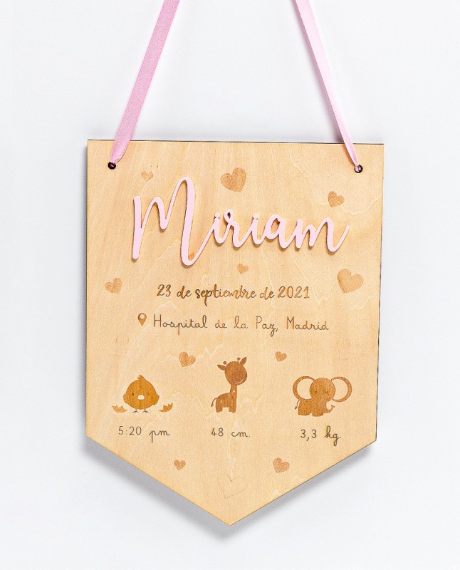 Este banderín de madera, lleva el nombre de la nena en letras de metácrilato del color rosa, a juego con la cinta para colgarlo en su habitación. En él se graba, a láser, todos los datos más relevantes del día de su nacimiento: día, lugar, hora, talla y peso. Decorado completamente con motivos infantiles también marcados a láser. Un bonito regalo para nacimiento que quedará siempre decorando su habitación.