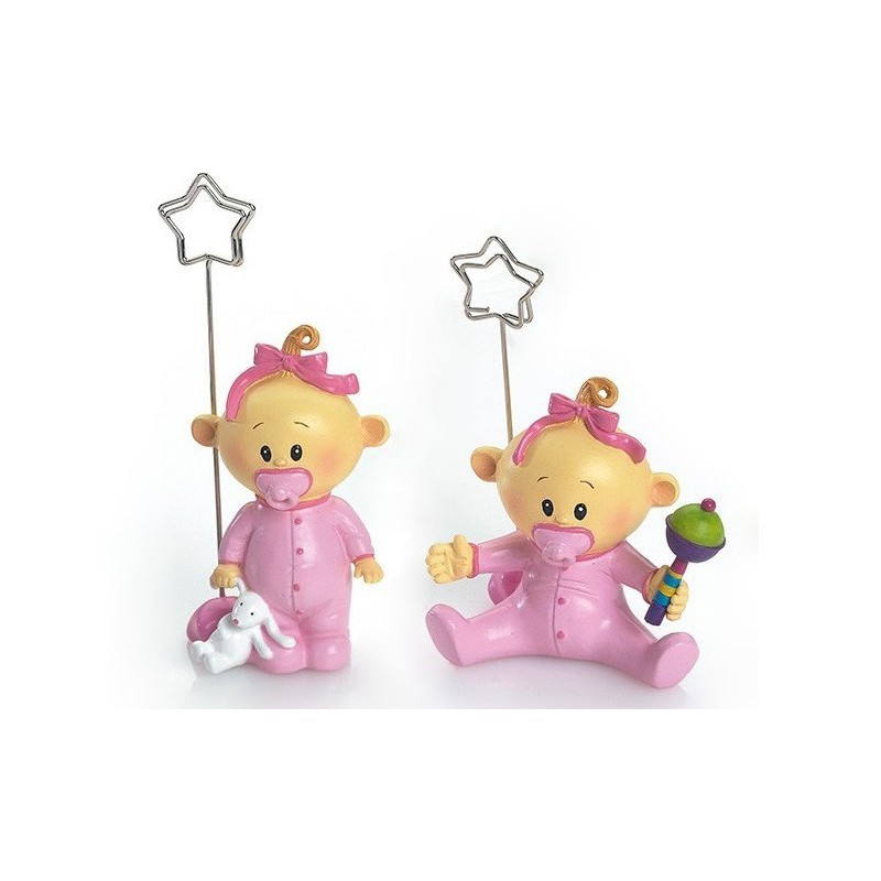 Figura cerámica de 8,5 cm. de bebé niña con chupete rosa, con clip para sujetar tarjeta o fotografía pequeñas, se sirven modelos surtidos.