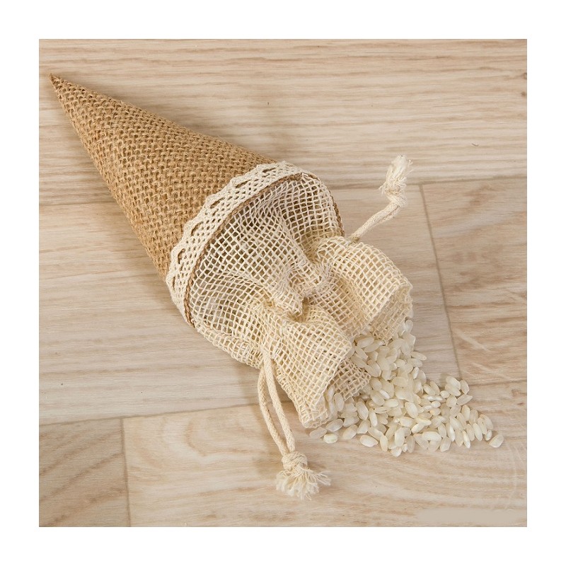 Cono de yute con cierre de bolsa para disponer el arroz o los pétalos de rosa de una manera práctica y elegante. Su diseño es perfecto para sostener con una sola mano y su cierre permite transportar fácilmente el contenido.