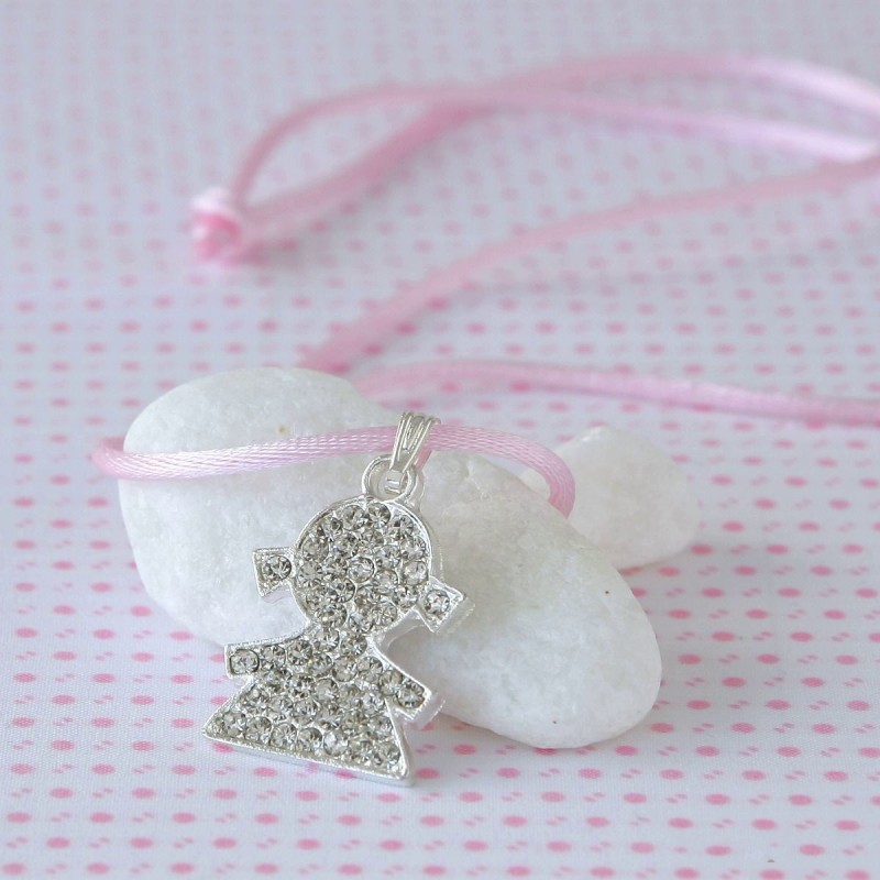 Maravilloso colgante con forma de silueta de niña en strass de 2x3cm. con cordón de seda en color rosa.