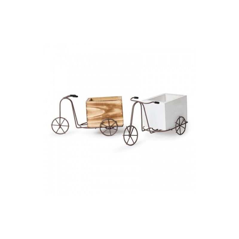 Un diseño actual al ser una bicicleta de metal y detrás lleva un cajón que sirve de macetero.