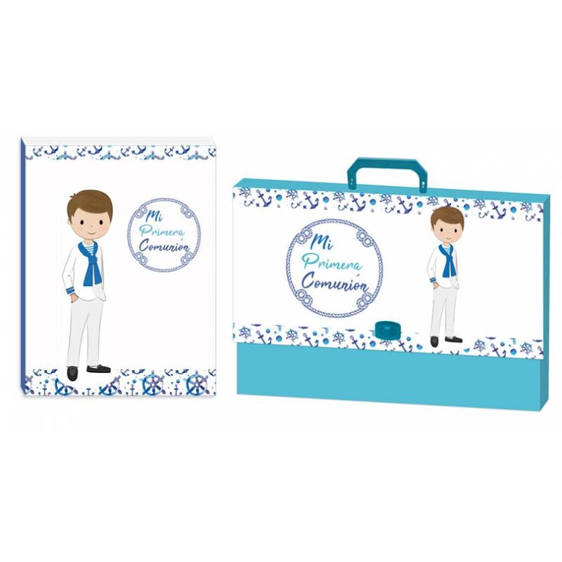 Álbum de fotos y firmas más lecturas de comunión, presentado en un estupendo maletín de cartón rígido con un bonito diseño de comunión niño con diseño marinero sobre un fondo azul mar.
